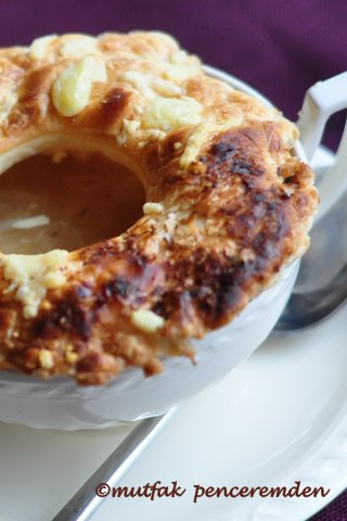 1-Çorbanızı kaseye koyduktan sonra üzerini milföy hamuru ile kapladıktan sonra üzerine  peynir rendeleyip fırınlayabilirsiniz.