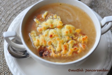 En önemli özelliği üzerine konan kızartılmış ekmek dilimi ve peynir rendesi olan soğan çorbası restoranlarda içileceği kaplarla birlikte fırınlandıktan sonra sunuluyor. Bu yüzden hem kasesi hem de kendisi çok sıcak olan bu çorbayı biraz bekletip içmek gerekiyor. Çok zormuş zannedilse de yapılışının herhangi bir çorbadan farkı yoktur, hatta daha da kolaydır. Soğan çorbasını bir iki ufak değişiklikle davet çorbası haline getirmek de mümkün. Şöyle ki; Çorbamızı tek tek porsiyonlar halinde ısıya dayanıklı kaselere döktükten sonra üzerlerini milföy hamuru ile kaplayıp fırına verebiliriz. Fotoğrafta da görebileceğiniz gibi hamurun ortasını önceden deliyor ve üzerine de bolca peynir rendeliyoruz.