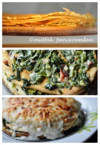 Fırına girebilecek bir kaba veya kek kalıbınızın çıkabilen alt parçasının üzerine bir adet krep koyup üzerine beşamelli ıspanaktan biraz sürüyor ve peynir rendesinden ekliyoruz. Bu işleme krepler bitene kadar devam ediyoruz. En son krebin üzerine ıspanak koymadan sadece kalan beşamel sosunu döküyoruz. Kaşar peynirinin kalanını da üzerine serpip orta hararetteki fırına veriyoruz. Krepler kurumadan sadece üzeri kızarana kadar fırında kalması yeterlidir.