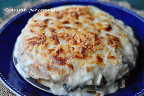Ispanağımızı yıkayıp hiç suyu kalmayana kadar kuruttuktan sonra 1 adet soğanla kavuruyoruz. Pastırmaları ufak doğrayıp içine katıyor, gerekiyorsa tuz biberle tatlandırıyoruz. Beşamel sosun yarısını ıspanağa katıyoruz.