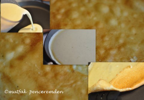 -İyice çırpılan yumurtalara yavaş yavaş biraz süt ve biraz un katarak koyu bir ayran kıvamına getiriyor, tuz ve şekerini de katıyoruz.