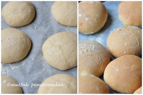 -Mayalanan hamuru ellerimizi unlayarak 15 eşit parçaya bölüyor, her birini yuvarlayıp sandviç şekli veriyor ve yağlı kağıt üzerine bırakıyoruz. 45 dakika /1 saat kadar tekrar mayalanmalarını bekliyoruz. Hamurlar kabaracağı için aralarına boşluk bırakıyoruz.