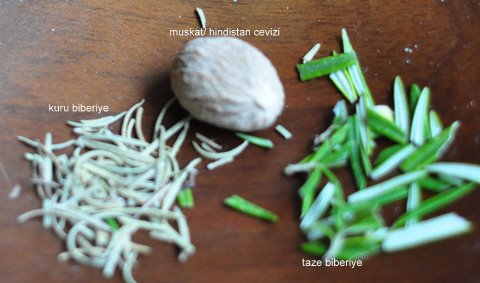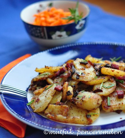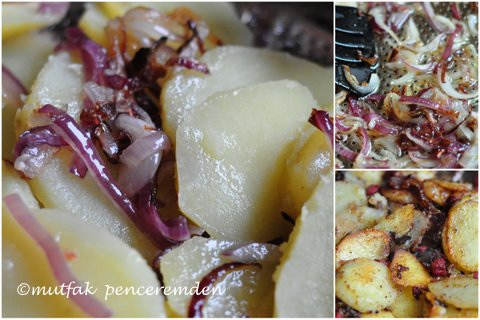 – *Tavamıza biraz tereyağı ve biraz da sıvı yağ koyduktan sonra kızdırıyoruz ve önce soğanları pembeleştirip sonra içine patatesleri de ekleyip patatesler iyice kızarana kadar döndüre döndüre ğişiriyoruz. En sonunda minik küpler halinde kestiğimiz sucuk veya pastırma veya jambonu ekleyip 2-3 dakika daha döndürüyor, tuz, biber, muskat rendesi ve biberiye ile tatlandırıyoruz. Arzu edenler servisten önce bir miktar kaşar rendesi de ekleyebilirler.