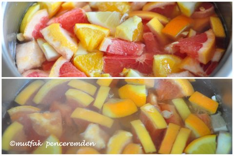 Birinci gün: 4 limonun çekirdeğini bir bardak suyun içine bırakıp üzerini örtüp buzdolabında veya serin bir yerde bekletiyoruz. Çekirdekler bir süre sonra suya jölemsi bir kıvam verecekler. Portakal ve greyfurtun birer tanesinin kabuğunu ayıklıyor, diğerlerini ve limonu kabuğuyla bırakıyoruz. Sonra bunları enlemesine kalınca dilimler halinde kesip sonra da istediğimiz ufaklıkta parçalara bölüyoruz. Ben biraz büyükçe parçalar kesiyorum ki görüntüsü de tadı kadar hoş olsun. Kesilmiş meyveleri büyükçe bir tencereye koyuyoruz ve üzerlerine tam 10 su bardağı su ekleyip kapağı kapalı olarak ertesi güne kadar serin bir yerde bekletiyoruz.