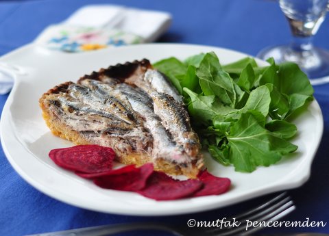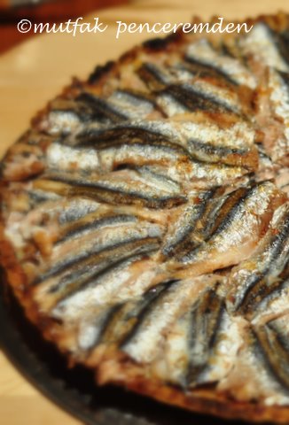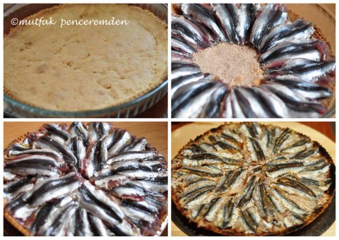 Kılçıkları çıkmış iyice yıkanıp süzülmüş ve yüz yüze yatırılmış hamsilerimizi zeytinyağı tuz ve karabiberle tatlandırıyoruz. Balıkların tamamını şekilde görüldüğü gibi mısır ekmekli tartın üzerine yerleştiriyoruz. (Bu arada eğer arzu ederseniz, balıkların iki katı arasına pembeleştirilmiş halka soğanları da yerleştirebilirsiniz. Çok nefis olacaktır.)