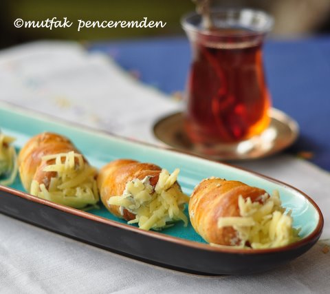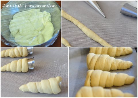 Eşit parçalara böldüğümüz hamur parçacıklarına elimizle fotoğraftaki gibi şekil veriyor ve sonra da metal kalıplarımızın dar ucundan geniş tarafına doğru arada boşluk bırakmadan sarıyoruz. Bkz. Fotoğraf.