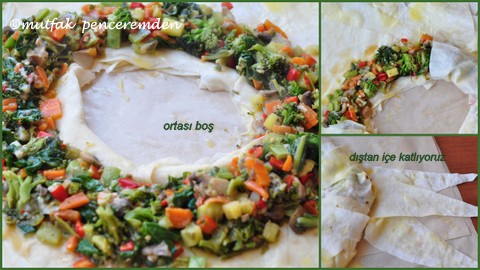 Merhaba, haklısınız bazan ne kadar detay vermeye çalışsak da görmek gibi olmuyor. Şöyle açıklayayım,evet üçgen uçlar iç kısımdan alta doğru dönüyor. Önce ince parçaların sonra kalın parçaların konmasının sebebi,geniş olanların sebzeleri kavrayabilmesi sebzelerin aralardan çıkmaması için. Dışta kalan ince üçgenler de diğerleri gibi içe döndürülüyor. Bu arada bu parçaların kabaran kenarları da böreğin görüntüsünü güzelleştiriyor. Sevgiler