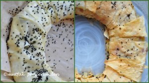 -Yufkalarımızı fotoğrafta görüldüğü gibi orta kısmı boş kalacak şekilde en alta ince parçaları üste geniş olan parçaları, her katı önceden hazırladığımız yağlı karışımla ıslatarak döşüyoruz.
