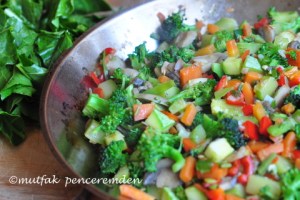-Sebzeleri, ıspanak hariç, çok zeytinyağı ile en fazla 10 dakika kadar sote ediyoruz. En son ıspanağı ekliyor ve ocağı söndürüyoruz. Sebzelerin rengini kesinlikle karartmamaya dikkat ediyoruz.