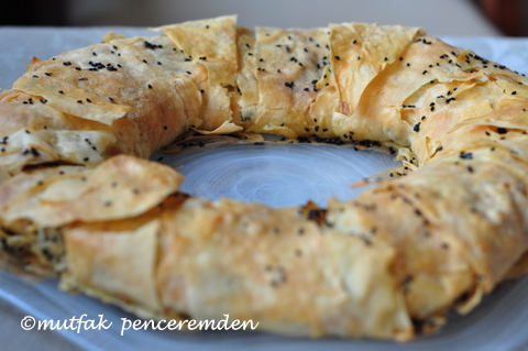 – Tezgahımıza, tepsimizi kaplayacak şekilde yağlı kağıt döşüyoruz. Ben bu böreği yuvarlak tepside yaptım.
