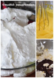 -Benmaride erimiş çikolatayı, ardından un ve en sonunda da yumurta karını bir tahta kaşık veya spatulle ağır ağır tek yönde karıştırıyoruz.Burada mühim olan yumurta karının içindeki köpüklerin sönmemesidir, çünkü bu kekte kabartma tozu kullanılmıyor ve keki ancak yumurta karı kabartıyor.