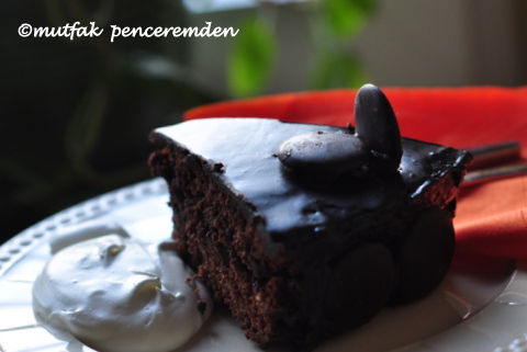 -Alt kata çikolata sosunun yarısını her tarafını ıslatacak şekilde döküyoruz.