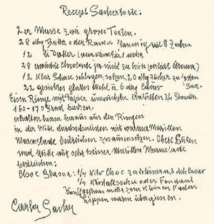 Sachertorte’nin gerçek tarifinin halen kimseyle paylaşılmadığı, gizli tutulduğu biliniyor, ancak 1980 yılında Franz Sacher’in bir kuzeni ile evli olan Carla Sacher’in, torununa pastanın orijinaline en yakın tarifi verdiği söylenmektedir.Carla Sacher’in el yazısıyla verdiği tarifte bir miktar kakao kullanılıyor ama orijinal pastada kakao yoktur.
