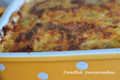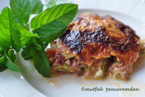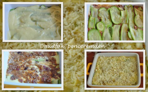 Ardından, bir fırın kabına kat, kat, börek yapar gibi bir sıra kabak, bir sıra sos ve kıyma sonra yine kabak ve bu şekilde yemeğimizi döşüyoruz.