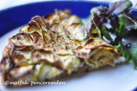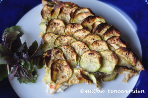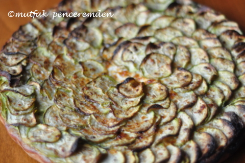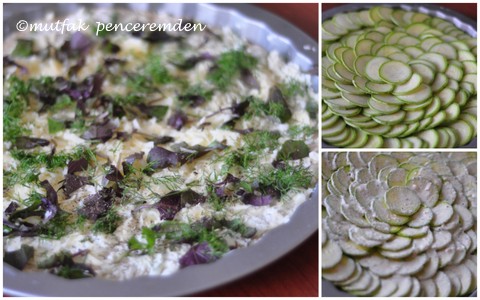Hamurumuzu yerleştireceğimiz kabın içini çok az yağladıktan sonra hamuru yayıyoruz. Üzerine önceden karıştırdığımız peynirleri, sarımsak rendesini ve kremanın yarısını sürüyoruz. Yeşillikleri ve kabakları fotoğrafta görüldüğü gibi yerleştirdikten sonra kalan kremaya pul biber ve karabiberi karıştırıp, kabakların üzerine sürüyoruz. Krema kabakların kızarmasını sağlayacak.