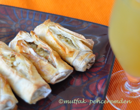 Bunun için de 1 yufkayı tezgaha yayıp üzerine önceden çırptığım 1 yumurta, su ve sıvı yağ karışımından sürüyorum. İkinci yufkayı da üzerine serdikten sonra yufkamdan duruma göre, fotoğrafta olduğu gibi ister 8 ister 10 tane üçgen kesiyorum. Geniş kenara harcı koyup kenarlarını katladıktan sonra geniş bir sigara böreği gibi sarıyorum. Üzerine tekrar kalan sıvıdan biraz sürüp,bıçakla şekildeki gibi hafifçe yarıyorum. Böylece hem böreğim daha kolay pişiyor hem de şık görünüyor.