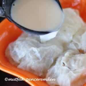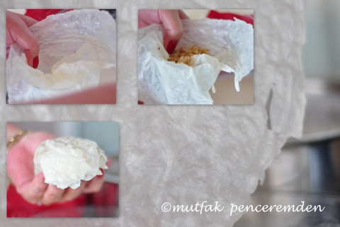 Sütümüzün içine şeker ve/ veya balı ekleyip eriyene kadar ısıtıyor sonra da biraz ılınmasını bekliyoruz. Burada mühim olan sütün yufkayı ancak yumuşatacak kadar ılık olması ama eritecek kadar da sıcak olmamasıdır. Sütü derin bir kaba boşaltıp, ikiye böldüğümüz, yufkaları içine daldırıp çıkartarak yumuşatıyor ve fotoğrafta görüldüğü gibi bir fincanın içerisine alıyoruz. İçine bolca ceviz koyduktan sonra ağzını kapatıp ters çevirerek tabağın içine alıyoruz. Diğer yufkaları doldurmaya devam ederken bir yandan da tenceredeki sütümüzden kepçeyle hazırladığımız güllaç topçuklarının üzerine döküyoruz. Sütü döktükçe güllacımız şişip kabarıyor. Süt bitene kadar bu işleme devam ediyoruz. En sonunda güllaçların üzerini Antep Fıstığı ile süslüyor, güllacımızı soğumak üzere buzdolabına kaldırıyoruz.