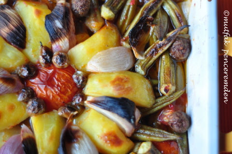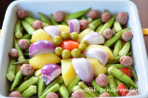 Küp domatesler, limon suyu ve biraz tuzla bamyaları kullanacağımız kabın içinde harmanladıktan sonra tepsinin ortasına gelecek şekilde elma dilimi gibi kestiğimiz çiğ patates ve soğanları fotoğrafta da görüldüğü gibi bir çiçek görüntüsü verecek şekilde diziyoruz. Et veya kıyma toplarını üzerine serpiyoruz. Ben ortaya korukları da ekledim.