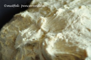 Hepsini yumuşak bir hamur olarak karıştırıyoruz, üzerini streçle örtüyoruz.