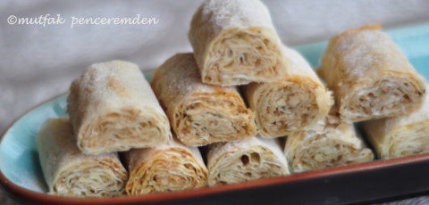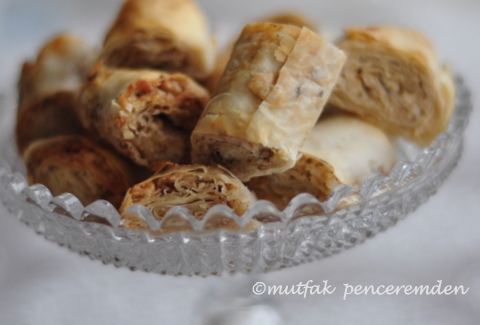 – İki yaprak yufkayı tezgaha alıyoruz. Bir fırça yardımıyla bir kat yufkanın üzerine tahin sürüyoruz. Bu aşamada ben tahine birazcık ılık su ekliyorum. Özellikle kenarlara daha çok sürüyoruz. İkinci kat yufkayı diğerine yapıştırıp üzerine tekrar tahin sürüyoruz. Şekerli cevizimizi de bu yufkanın üzerine bolca serptikten sonra, fotoğrafta da görüldüğü gibi bir uçtan diğerine doğru sıkıca sarıyoruz.