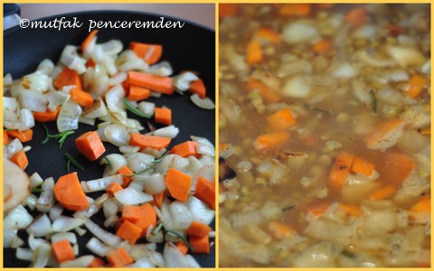 – Tavamıza tereyağımızı koyup eritiyoruz. Küp kesilmiş soğan ve ardından da havuçları ekleyip pembeleştirirken kıyılmış sarımsakları, taze defne ve biberiye yapraklarını ve azıcık da kereviz sapı ekliyoruz. Üzerine mercimeği ve 3 bardak suyu ekliyoruz. Bu suyun bir bardağının kemik veya et suyu olmasını tercih ediyoruz.