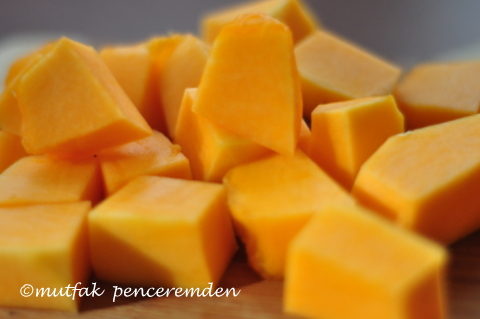 Sevgili yeğenim Yaprak, aslında “Nuh “ dedi mi,” peygamber” demeyecek kadar ,“ dediğim dedik” bir yapıya sahip olmasına rağmen, önceleri hiç ağzına koymadığı “balkabağı” nı yemeyi ve pişirmeyi Amerika’da eğitim aldığı yıllarda öğrenmiş. Evlendikten sonra da, hepimizi şaşırtarak, balkabaklı cheescake, balkabağı çorbası, balkabaklı kek, fırında baharatlı balkabağı gibi birçok çeşidini pişiriyor. Bununla yetinmeyip balkabağıyla yapılabilecek değişik yemek tarifleri bulmak için araştırma bile yapıyor. Onun sayesinde biz de oldukça farklı tatlar deneme şansını elde ediyoruz. Bugün sayfamızda yer alan tarifi de BBC televizyonun bir yemek programından bulmuş ve hemen hayata geçirmiş. Sonuçtan fazlasıyla memnun kalınca, tarifin videosunu benimle paylaştı. Video insanı gerçekten etkiliyor. Daha önce yan yana düşünemediğiniz şeylerin nasıl da ustaca uyumlandığını gördüğünüzde bir an önce mutfağa girip siz de denemek istiyorsunuz.