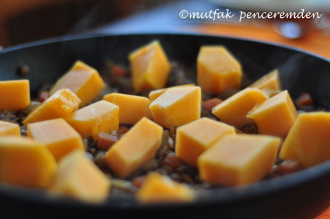 -30 Dakika üzeri kapalı olarak, kısık ateşte pişirdikten sonra irice küpler halinde kestiğimiz kabakları yemeğimize ekliyoruz. Tuz, karabiber, kimyon, taze veya toz kişniş, ve üzerini örtecek kadar su ilave ediyoruz.