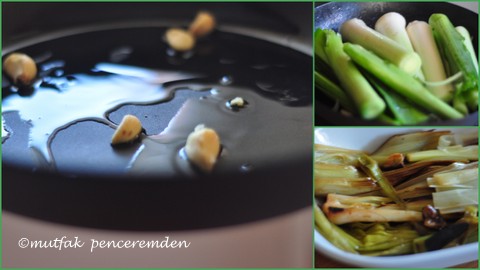 Genişçe bir tavaya biraz zeytinyağı koyup altını açıyoruz. Birkaç diş sarımsak ekleyip hafifçe pembeleştiriyor ardından iyice yıkanmış ve yaklaşık 10 cm. uzunluğunda kestiğimiz pırasaları ekliyoruz. Pırasaları iyice yumuşayana ve renkleri dönene kadar ağır ağır, alt üst çevire çevire kavuruyoruz. Yumuşayan pırasaları boyuna olmak üzere bıçakla yarıp şekilleri bozulmadan alt üst edip biraz da kapak kapatarak pişiriyoruz. Toplam kavurma süresi 20- 25 dakika kadar. Ardından pırasaları bir spatula yardımıyla fırın kabımıza alıyoruz. Üzerine önceden pişirerek hazırladığımız kıyma harcını döküyoruz. (Bu harcı, soğan ve renkli biberleri, iyice söndürdükten sonra içine kıymayı ve domates sosunu katıp biraz da su ekleyerek pişiriyoruz.)