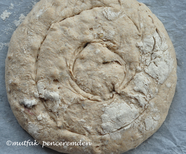 Üçüncü adım: Dinlenen hamura** önceden una buladığımız üzüm ve fındıkları karıştırıp tekrar yoğuruyoruz. Şekil verip üzerini unlayıp örttükten sonra oda sıcaklığında en az 3 saat kadar mayalandırıyoruz.