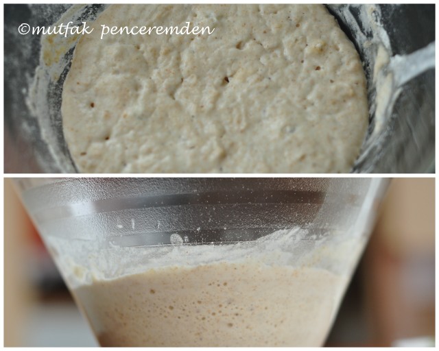 *Mutfak terazisi yoksa 160 gr. hamur yaklaşık 7-8 silme çorba kaşığı kadar geliyor.Bu arada ön hamurun kalanını başka bir ekmek için buzdolabına kaldırıyoruz. Ben bu hamuru ekşi maya kavanozuma ekliyorum.