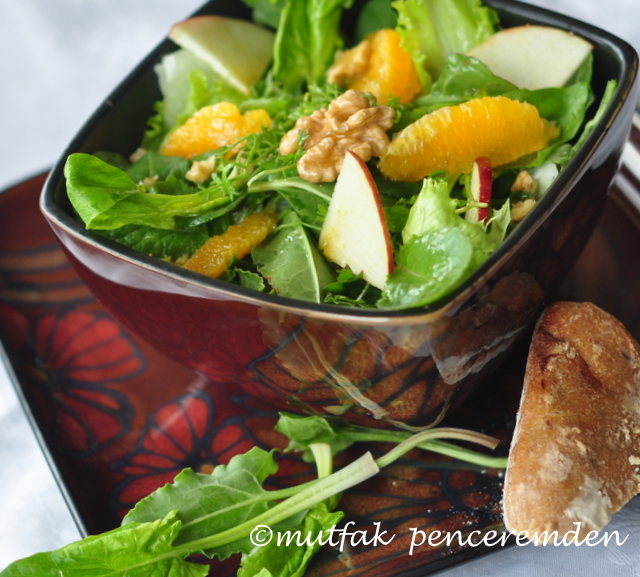 Et yeme, tavuk yeme, üç beyazı yeme derken yenebilecekler listesinden bugün size kuzukulağı ve kıvırcığı seçtim. Hazır köyden taze yeşillikler gelince bir portakal biraz ceviz ekleyerek sağlıklı bir salata yapıverdim.Yakında saksılarımda yetişen otlar da bu salatalara girecek. Ama az sabretmem lazım. Yapılışı da malzemesi de basit olunca yazacak fazla bir şey olmuyor. Ancak yazımın girişini  gözardı etmemenizi öneririm.Bu konuda geçtiğimiz hafta sonu yine bir konferanstaydım ve dinlediklerim hiç de iç açıcı değildi. Duyduklarımı kaleme almak içim bile bir süre sindirmem, paylaşabilmek için uygun kelimeleri bulmam gerekiyor. Sağlığımız maalesef  yediklerimizin tehdidi altında.Şimdilik, lütfen tavuktan ve özellikle raf ömrü uzatılmış gıdalardan uzak duralım diyerek salatamın tarifine geçiyorum. Gelecek hafta bu konuda daha geniş bilgi paylaşacağım.:))