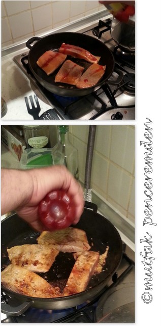 Kapaklı döküm tavamızı kızdırıyoruz. Zeytinyağını ve bütün haldeki sarımsak dişlerini ekliyoruz. Hemen ardından balıkları tavaya yerleştiriyoruz. Soya sosu, hardal, salsa sosunu sırayla ekledikten sonra en sonunda portakal suyunu da ilave edip balıkları alt üst ediyoruz. ( Yaklaşık 5-7 dakika)