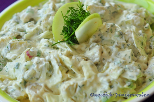 Bu arada sosumuzu hazırlıyoruz: Mayonez veya süzme yoğurtlu mayonezin içine ince kıyılmış taze soğan,kapari, turşu ve hardalı ekliyoruz. Bu sosa enginarları kattıktan sonra ekşi elmamızı soyup parçalara ayırıyor ve cips inceliğinde kesiyoruz. İsteyen minicik küpler halinde de kesebilir.En son elmayı ekleyip salatamızı süslüyoruz.