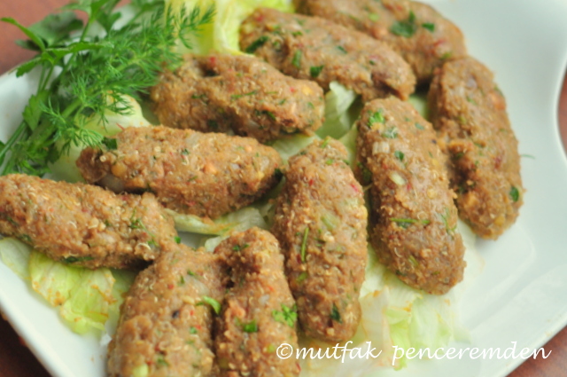 İnce kıyım taze soğan ve maydanozu, pul biber ve zeytinyağını karıştırdıktan sonra üzerini örtüp biraz demlenmesini bekleyip köfte şekline getiriyoruz.