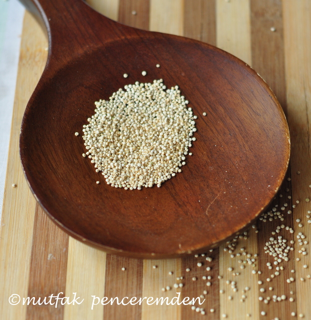 -Yarım bardak kinoyı önceden 1 saat kadar suda bekletip 1 bardak suyla pişiriyoruz. Biraz diri pişmiş pilav gibi oluyor. Suyu kalmaması gerek.