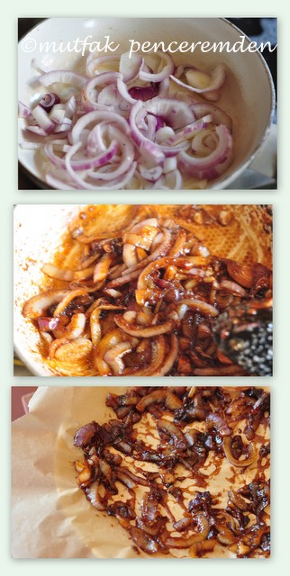 -Önce soğanımı minik küpler halinde kesip kuruttuktan sonra bir tavada çok azıcık, bir damla kadar yağ ile döndürüp sonra 1 yemek kaşığı toz şeker ekleyip ağır ağır karıştıra karıştıra karamelize ediyorum. Soğanlar simsiyah olmayacak ancak iyice kahverengi olacaklar. Bunları bir parça yağlı kağıt üzerinde soğutuyorum. İsterseniz halka soğan da kullanabilirsiniz.Soğan karamelize etme işlemi önceden yapılırsa ve soğanlar iyice sertleştikten sonra kullanılırsa daha nefis olacaktır.