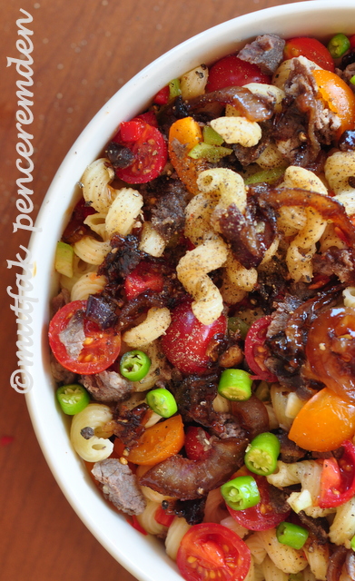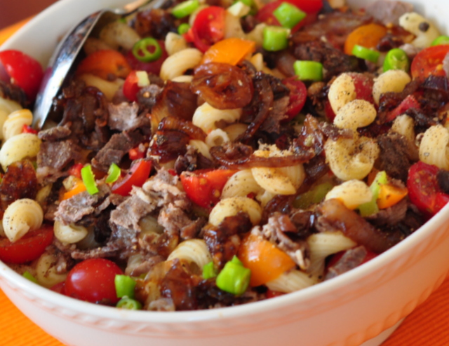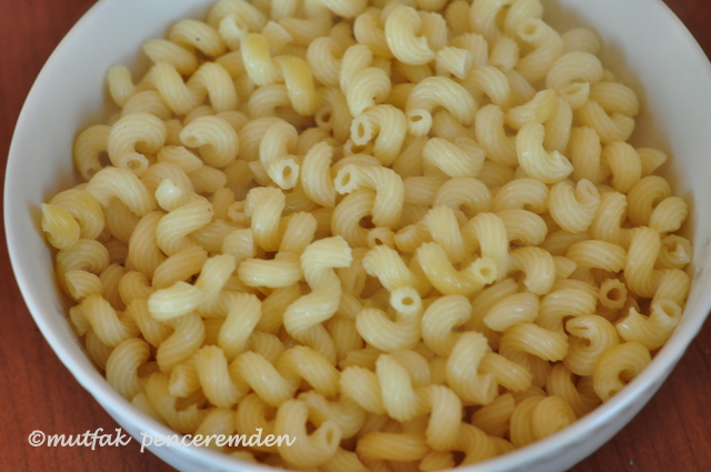 Çıtır soğanlı, etli makarna salatası