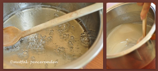 Genişçe bir tencereye şeker ve suyu koyup karıştıra karıştıra kaynatmaya başlıyorum. Ben çelik tencere kullanıyorum ama rahmetli sadece bakır tencere kullanırdı. Hem zaten o benim gibi azıcık değil en az bir kilogram şekerle işe başlar, o yüzden de son zamanlarında çevirme yaparken çabucak yorulur, yardım isterdi. İşte ben de böyle bir günde onu izleyip öğrenmiştim bu işi.