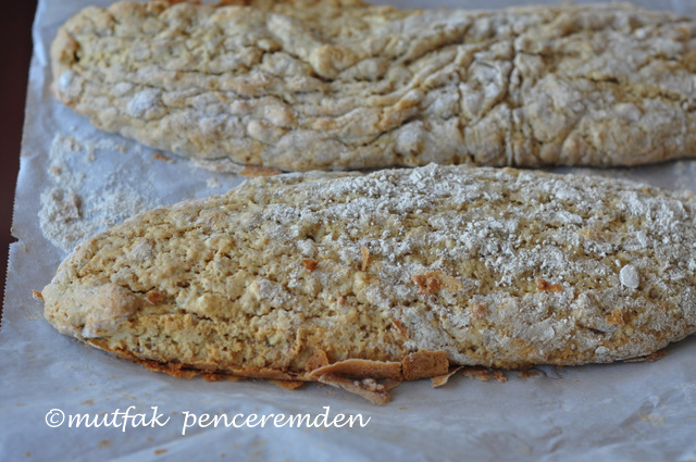 Fırın teline dizdiğim kek dilimlerini yaklaşık 140 derecede 30 dakika kadar daha pişiriyorum. Ve pişme süresi dolunca fırın soğuyuncaya kadar kapağı aralık olarak bekletiyor, sonra biscotları dışarı alıyorum.
