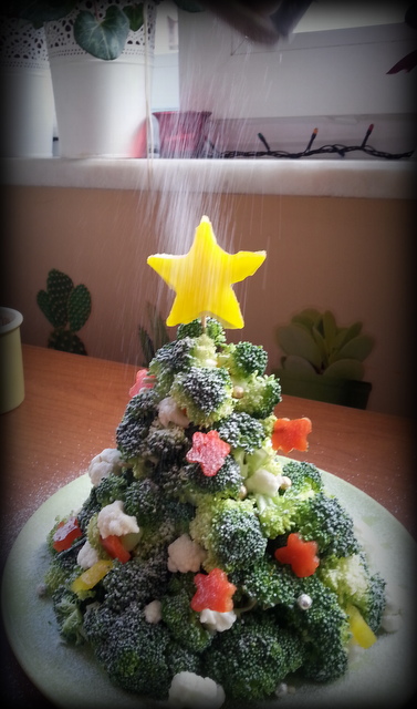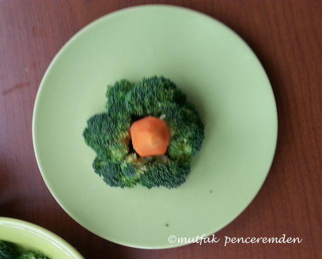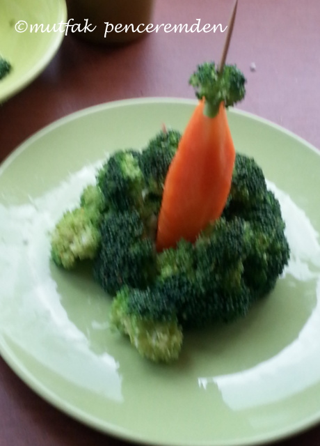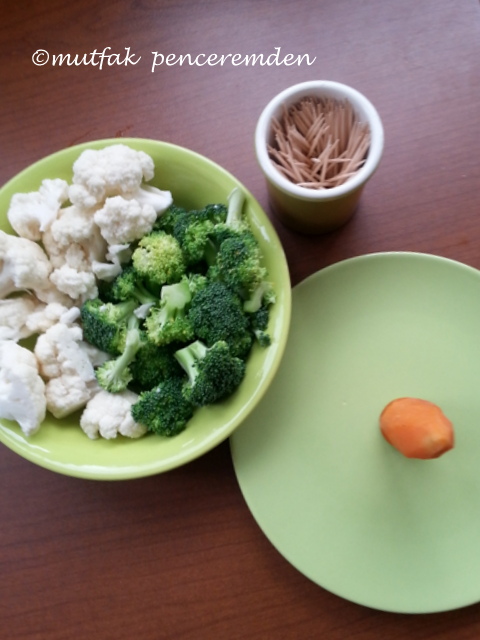 Çam ağacımızı hazırlamak için öncelikle haşlanmış bir havuç ve çiğ olarak brokkoli ve karnıbaharları hazır ediyoruz.Havucu gördüğünüz gibi tabağımızın ortasına diklemesine yerleştiriyoruz. Bir sonraki adım havucun kenarına ilk brokkoli parçalarını dizerek ağacımızın dibini yapıyoruz.