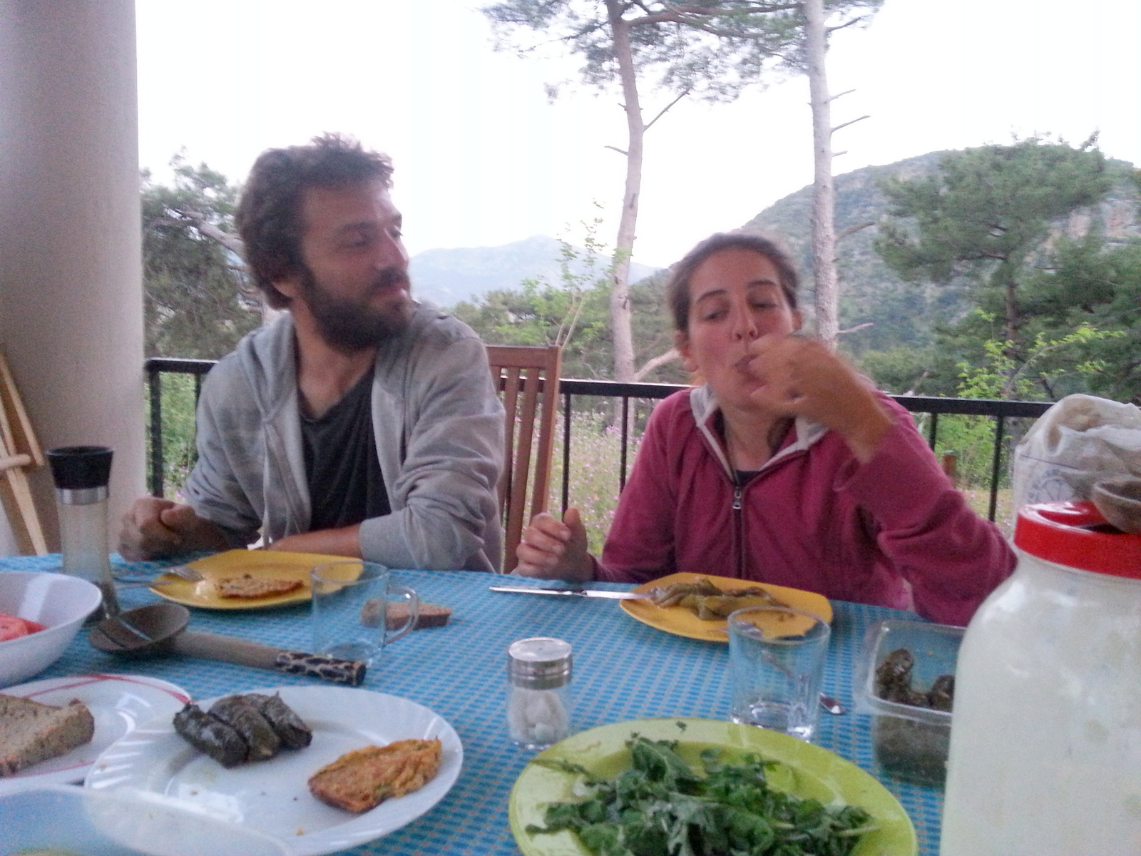 Tabii orada bulunduğumuz süre içinde sadece bir kez yemek pişirdik, çünkü İstanbul’dan hazırlayıp götürdüğüm mücver,börek,pırasa köftesi ve zeytinyağlı sarma ve tabii kurabiyeler birbirimize daha fazla zaman ayırabilmemize yardımcı oldular. Sarma deyince muhakkak paylaşmam gereken bir fotoğraf var; Burcu’nun dolmaları mideye götürüşü. Üç gün boyunca dolma kutusunu altından girdi üstünden çıktı. Bun arağmen döndüğümüzde hâlâ bitmemişti dolmalar. Biraz abartmış mıyım yaparken, ne?