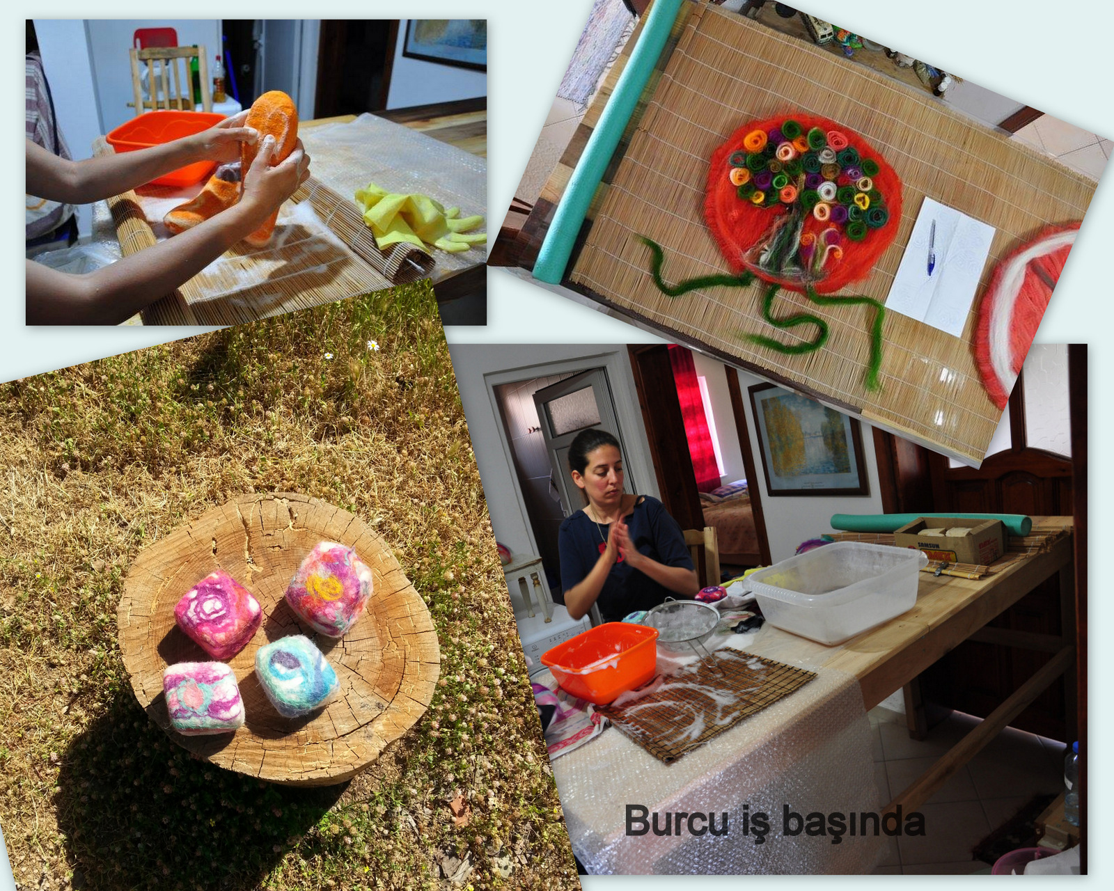 Burcu’nun keçe işlerini çok merak ediyordum. Köyün marangozuna yaptırdığı keçe çalışma masasının başına geçtik; Burcu gösterdi ve birlikte çalışmaya başladık. Renklerle oynamak, sonra her şeyi oluruna bırakıp sürprizlerle karşılaşmak, ortaya çıkan her şeyden memnun olmak. Bunlar harika duygular. Keçe işinin detayı da Burcu’nun yazılarında var. Üstelik yaptıklarını satışa sunduğu bir de adresi var. https://www.facebook.com/pages/BoloBolo-Burcunun-%C4%B0%C5%9Fleri/394914757326211?fref=ts