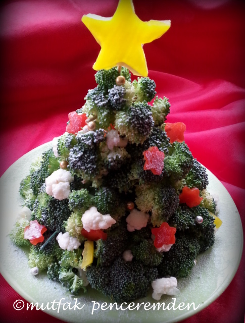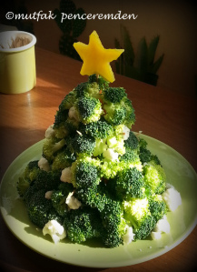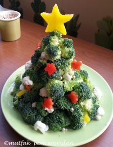 Brokkoli parçacıklarını kürdana saplayıp havuca saplayarak yukarı doğru ağacımızı oluşturuyoruz. En üste koyacağımız yıldızı ister sarı ister kırmızı biberden kurabiye kalıbıyla kesiyoruz.