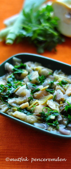 Malzemeleri yıkayıp ayıkladım. Ayvaları küp, küp, pırasaları ince dilimler halinde, soğanı da incecik kestim. Zeytinyağında önce soğanı, hemen ardından da pırasayı ekleyerek, kısık ateşte söndürdüm. En son ayvaları üzerine ekledikten sonra yarım bardak ılık su ekleyip, kısık ateşte pişirdim, tam ateşten almadan önce de maydanozunu ilave ettim. Azıcık limon da sıkarak tatlandırdım. Sıcak veya ılık, hatta soğuk yiyebilirsiniz.