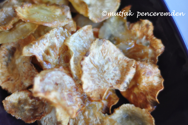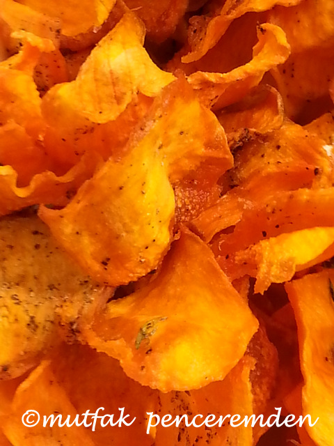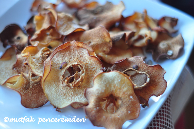 Ben patatesi bile fırında kızartmaya çalışırken geçtiğimiz yıl balkabağını nasıl yapar da hem keyifle hem de daha fazla tüketebiliriz diye balkabağını cips yapmayı denemiş, oldukça da başarılı olmuştum. Bu yıl biraz daha ileri gidip önce kerevizi sonra da ayvayı cips yapıp fırınladım. İnanın her ikisi de nefis oldu. Balkabağı ve kerevizi zeytinyağı batırdığım fırçayla çok hafif yağlayıpbiraz da tuzlayıp, yağlı kağıt üzerinde önce on dakika 180 derecede sonra yaklaşık 30 dakika kadar 75 derecede kuruttum. Sonra, ancak sebzelerimin suyunu tamamen saldığına ve fotoğraflardaki gibi kıvrıldığına emin olunca fırını söndürüp kapağı açık olarak soğuttum. İyice soğuduktan sonra bir teneke kutuya koydum. İki, üç gün boyunca tükettik.