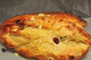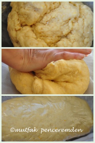 175 gr. tereyağını eritip şeker, limon kabuğu ve yumurta ile karıştırdıktan sonra kalan sütle beraber bekleyen hamura katıp mikser ile karıştırmaya başlıyoruz. Daha sonra da elle yoğurarak elastik bir hamur elde ediyoruz.