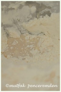 Un ve tuz, elendikten sonra içine 75 gr. ılık süte katılmış mayayı katıyoruz ve yoğurmadan üzeri örtülü olarak 15 dakika bekletiyoruz.Bkz. üst foto.