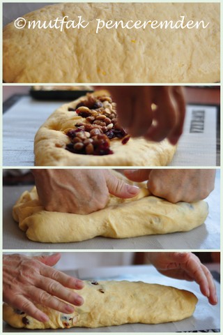 -Hamur fark edilecek kadar kabardığında içine meyve ve yemişleri de katıyoruz ve üzeri örtülü olarak tekrar 2 saat bekletiyoruz.