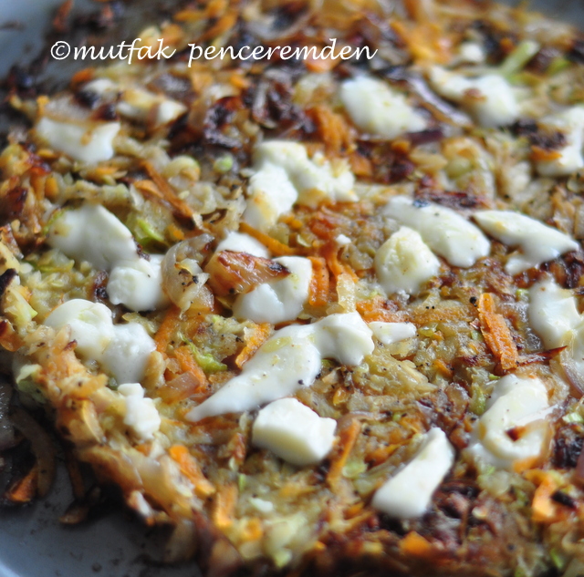 Sebzeleri iri rendeden rendeledim. Soğanı da ince piyazlık kesip sonra biraz daha küçülttüm. Yanmaz tavaya zeytinyağını, ardından soğanları koydum, sadece bir iki dakika sonra sebzeleri ekledim ve bu karışımı spatülle tavaya yaydım. Aynı omlet pişirir gibi bir kez tabak yardımıyla ters yüz ederek iyice pişirdim. Biraz sonra çıtır çıtır sebzelerimden bir pizza tabanım oldu.Hemen üzerine ufak doğradığım dil peynirlerini koydum. Ocağı söndürdükten sonra üzerine iki dakika dar kapak kapattım ki peynirler erisin. Yanına bol yeşillikli bir salata. İşte size hafif ve kolay bir yemek.
