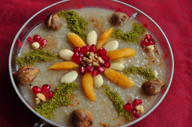 – Artık minik kesilmiş kuru kayısılar, isteniyorsa incir, fındık, badem, kestane, sultani üzüm aşureye katılır ve bir iki dakika sonra ocak söndürülür. Ben kayısı ve kestaneyi kaselerin dibine koymayı üzerine aşureyi dökmeyi tercih ederim. Bu da size kalmış bir şey.